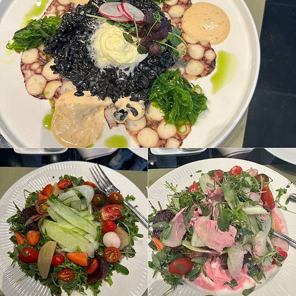 琪琪點的義大利飯超好吃,希臘被羅馬統治過,據說他們的義大利麵也很好吃,那個章魚片好好吃,我點的沙拉也好吃,沙拉醬是希臘酸奶跟紅菜頭汁混在一起,好吃又好看,希臘的醬汁奶香味重但吃口又很清淡,我因為熱累睡得少,沒啥胃口,所以也沒點其他的,每天吃最多的是希臘酸奶。老人家跟我一樣是沙拉,配著免費麵包就夠了